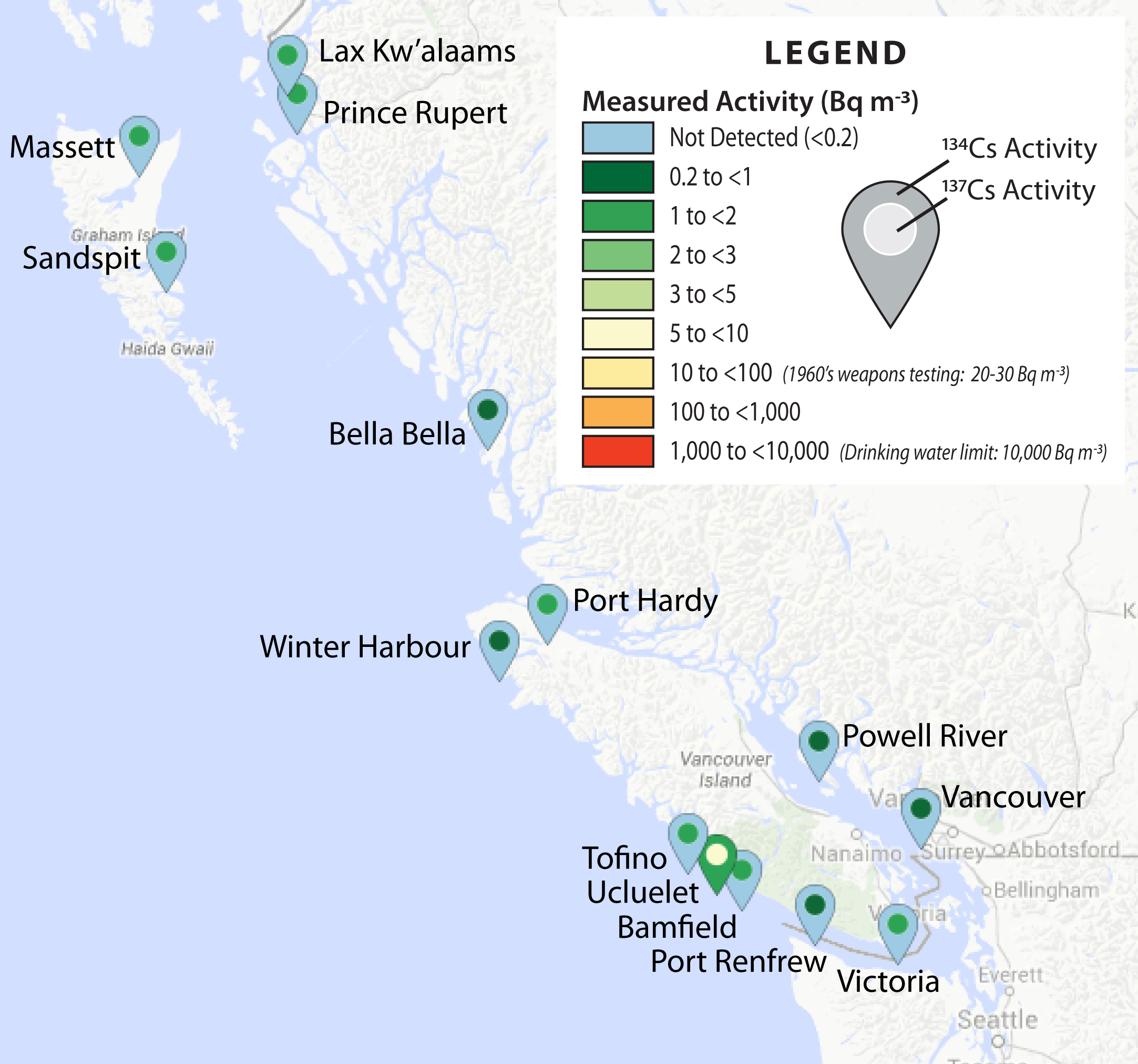 Results* from early February and March are now available from 10/13 of the InFORM sampling locations. Recent samples from Bamfield, Vancouver, and Powell River are still being processed. To date, no InFORM coastal samples have detectable (detection limit ~0.2 Bq m-3) levels of 134Cs, the radionuclide that is the fingerprint of Fukushima derived radiation due to its short half life (~2 years). An interesting note is that the February Tofino sample was collected on the 7th, just 12 days before the ORO sample collected in Ucluelet that was the first to contain measureable 134Cs. Similarly, the InFORM sample from Port Renfrew was collected on February 13th and also did not have any measureable 134Cs. These results highlight the necessity of frequent sampling in multiple locations to effectively document the arrival of the Fukushima plume along the coast of BC. The next months of sampling should illuminate the circulation times of coastal BC waters as the plume permeates our local marine environment.