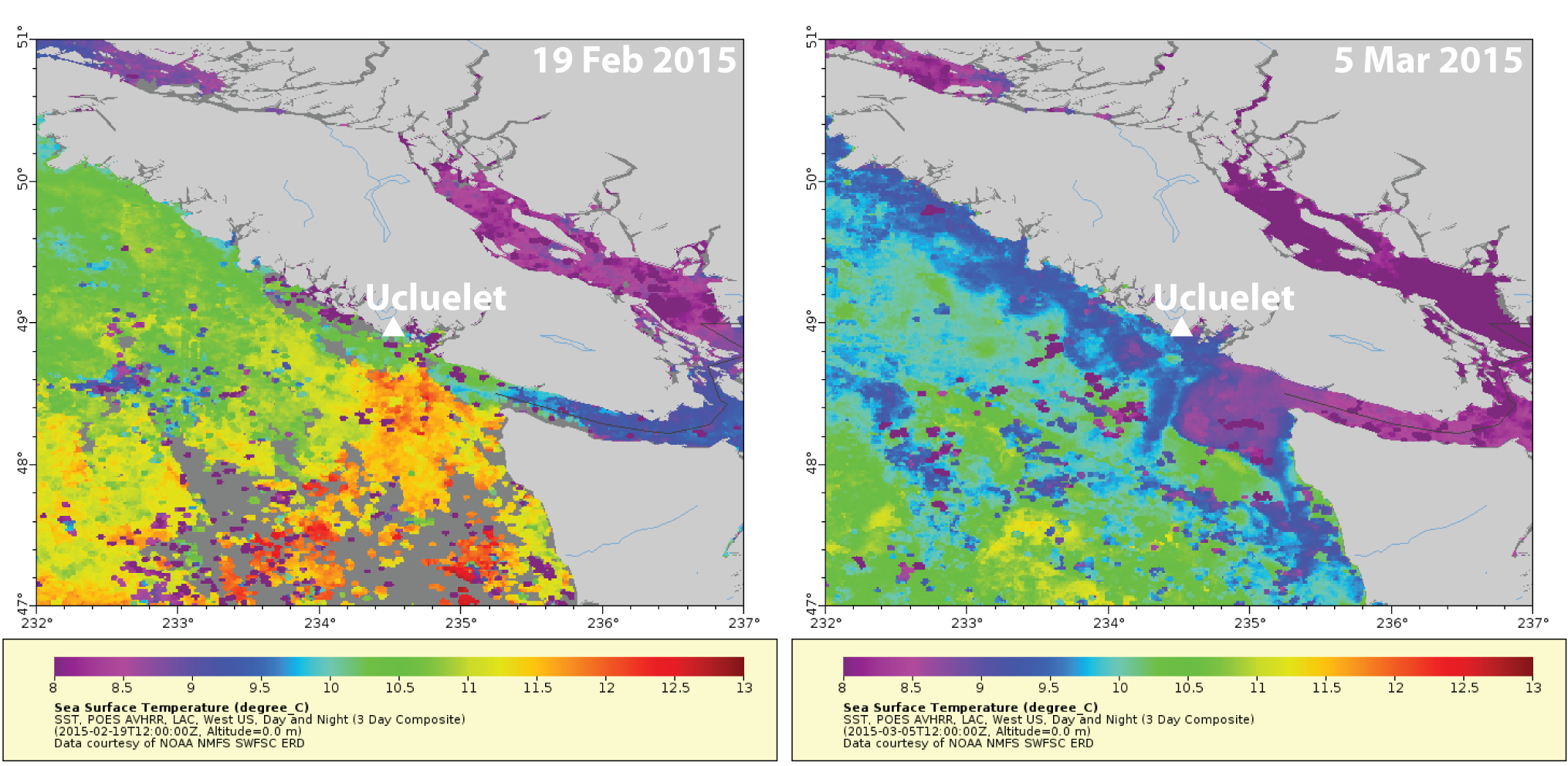 After examining satellite measurements of sea surface temperature, we find that the days leading up to the February sampling in Ucluelet had particularly warm water, as indicated by yellow-red colors above left, pushed up against the coast. In the days following sampling, that warm water retreated offshore, as indicated by dark blues and purple colors above right. The Fukushima signature, 134Cs, is likely tied to that warm water mass that was brushing the coast for a few days in mid February. This sampling period highlights the dynamic nature of the coastal system and the necessity for regular measurements to understand the complete story.