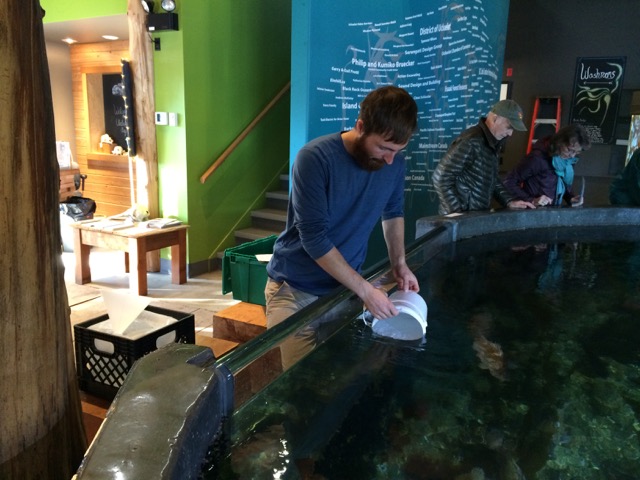 Ucluelet Nov 15 November 30, 2015 640 × 480 November Water Sample from Ucluelet Andrew McCurdy of the Ucluelet Aquarium collects an InFORM sample from the main tank.