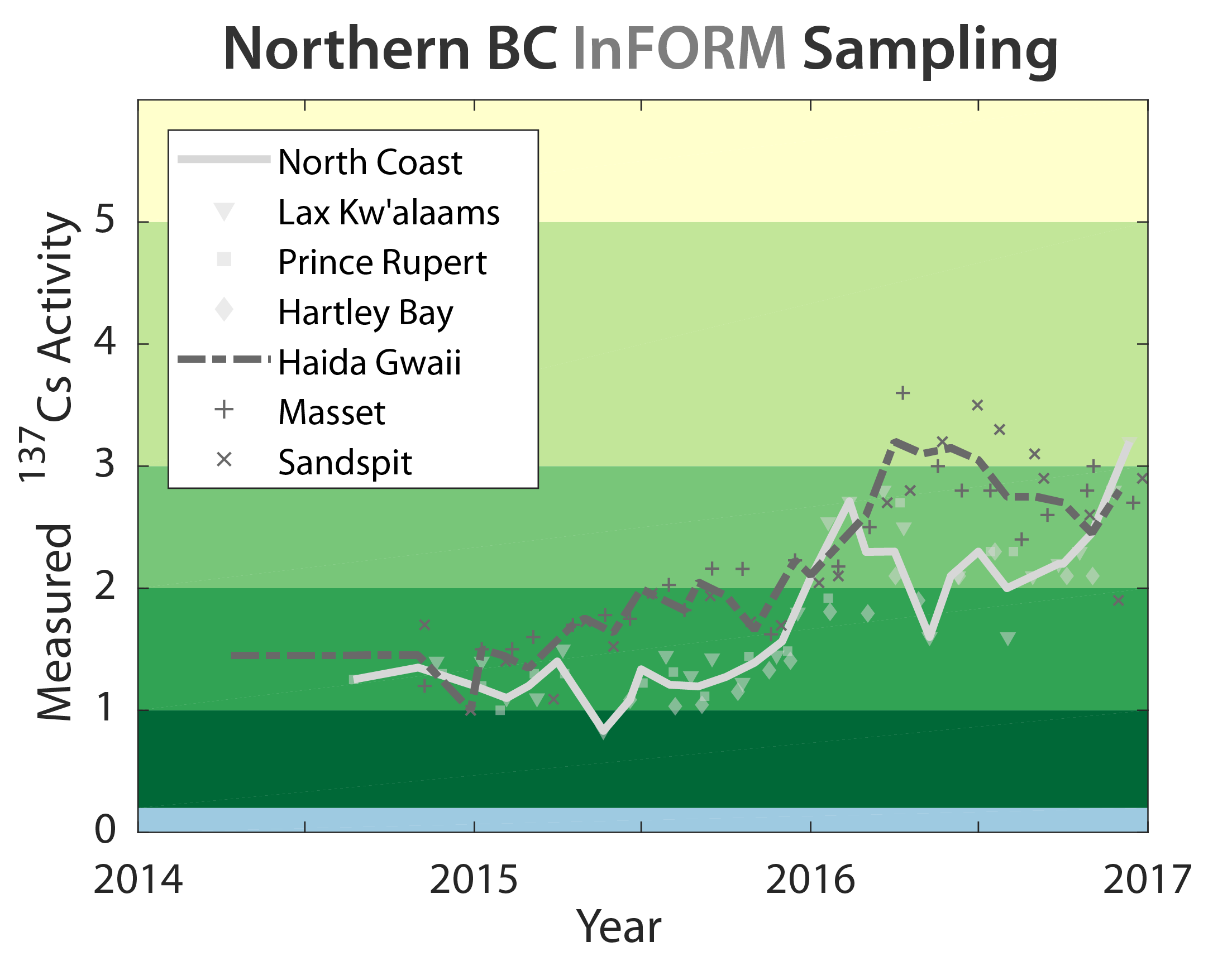 Over two years of monitoring, a pattern is developing where the 137Cs activities measured from Haida Gwaii and the North Coast only closely resemble each other during the winter months. During the summer months, however, samples from Haida Gwaii are considerably higher than their nearby North Coast communities. Interestingly, measurements from Sandspit are more consistent with those from Masset even though one might think they should more closely reflect Hartley Bay. To understand this signal, we need a better understanding of circulation in northern BC.