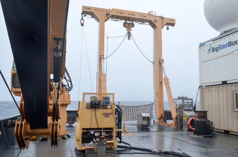 The aft deck of the CCGS John P Tully. The kevlar winch is on the left while the trace metal clean processing container is on the right. Standard water sampling (for oxygen, nutrients, temperature, and salinity measurements) are done with a CTD rosette on the starboard (right) side of the ship.