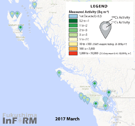 Extended testing of select 2016 salmon samples has identified the Fukushima-fingerprint isotope in one sample re-measured. The maximum level of contamination observed in a sample (134Cs: 0.07 Bq kg-1, 137Cs: 0.51 Bq kg-1) is over 1,700 times lower than the Health Canada Action Level (1,000 Bq kg-1) and is not known to be a health risk for either humans or the environment. This was the second time that InFORM has detected 134Cs out of nearly 400 salmon sampled to date. Read the full report.