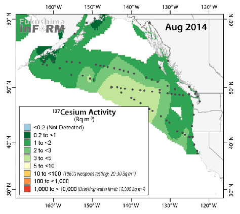 We are often asked how we can be confident that our observations are representative of the peak concentrations likely to come from Fukushima since, after all, radiation is still leaking into the ocean daily. It is very true that elevated radiation concentrations are measured in the waters of Fukushima port, but current conditions (~300-900 Bq m-3) are far, FAR below the peak concentrations (~70,000,000 Bq m-3) that were observed in April 2011 following the explosions at the nuclear power plant. TEPCO monitors the conditions in the Fukushima port with a sensor that reports data every 10 minutes online (note the units: 1000 Bq L-1 = 1 Bq m-3). This relatively little flow of radiation mixes with the surrounding ocean and is challenging to detect off the coast of Japan, much less across the Pacific. The entire suite of observations since 2011 makes us confident in our conclusion radiation levels will not reach those known to pose a significant risk to either humans or ecological health.