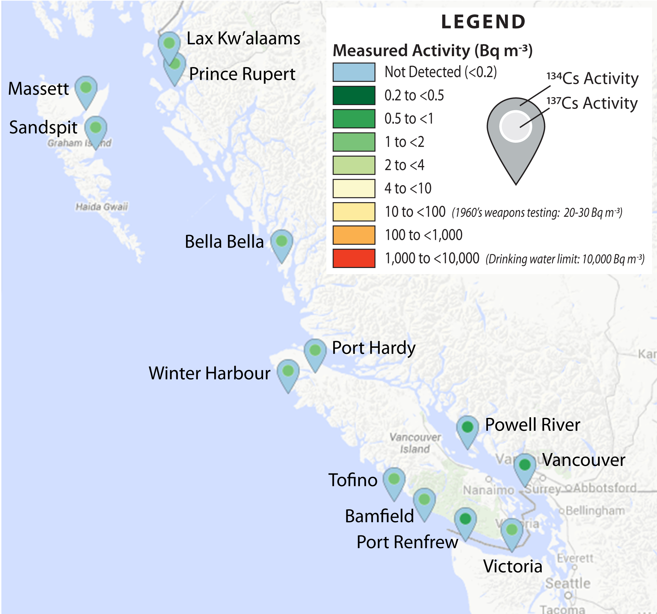 The absence of detectable 134-Cs indicates that waters near these locations spanning the length of British Columbia have not been contaminated with Fukushima radioactive elements transported across the Pacific by prevailing currents as of Nov 2014. The presence of 137-Cs is due to historical sources of this human made isotope owing to atmospheric nuclear weapons tests in the 20th century and contamination from the Chernobyl disaster in 1986. You can read about the levels of 137-Cs in the North Pacific pre-Fukushima here.