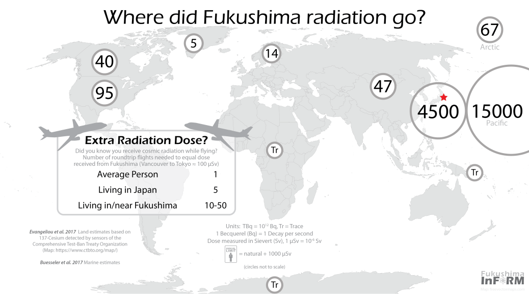 I am writing this post is to bring the public up to date on monitoring efforts of my research program into the impact of the Fukushima Daiichi Nuclear Power Plant (FDNPP) accident on environmental and public health here in North America. This post is part of an ongoing series summarizing work carried out by the Integrated Fukushima Ocean Radionuclide Monitoring (InFORM) project. Eight years since the peak in releases to the environment our project continues to measure radioisotopes released from the FDNPP that have the potential to present radiological health risks to living things. InFORM makes measurements of levels in seawater and common marine organisms as consumption of seafood is one of the most likely ways that residents of North America could be exposed to Fukushima derived contamination. We have found that: